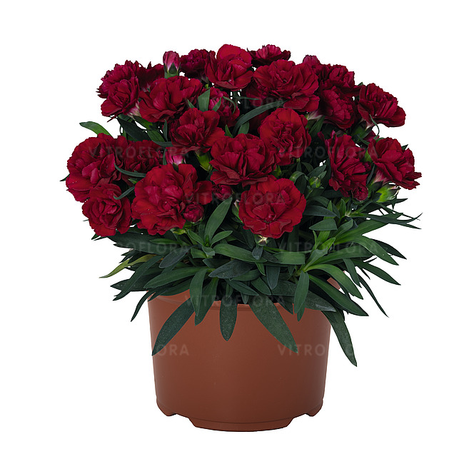 Гвоздика серии Sprint (Спринт)- куст растет аккуратной шапочкой, полностью покрывает горшок и свивает по краям. Цветки расположены над листьями, ароматные, диаметром 3 см. Цветение с июня до заморозков очень обильное.