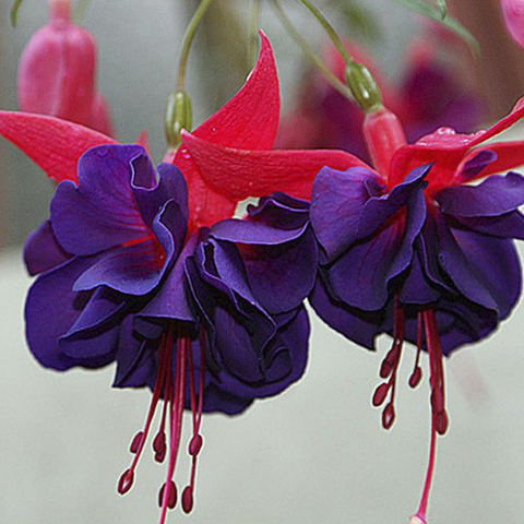 Dark Eyes- Компактная фуксия с многочисленными махровыми цветами. Очень нарядный и яркий сорт. Чашелистики насыщенно-красные, юбочка яркая сине-фиолетовая, со временем светлеет до синего тона. Высота куста: 15-30см Форма куста: полуампельный