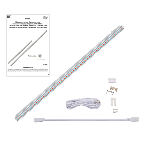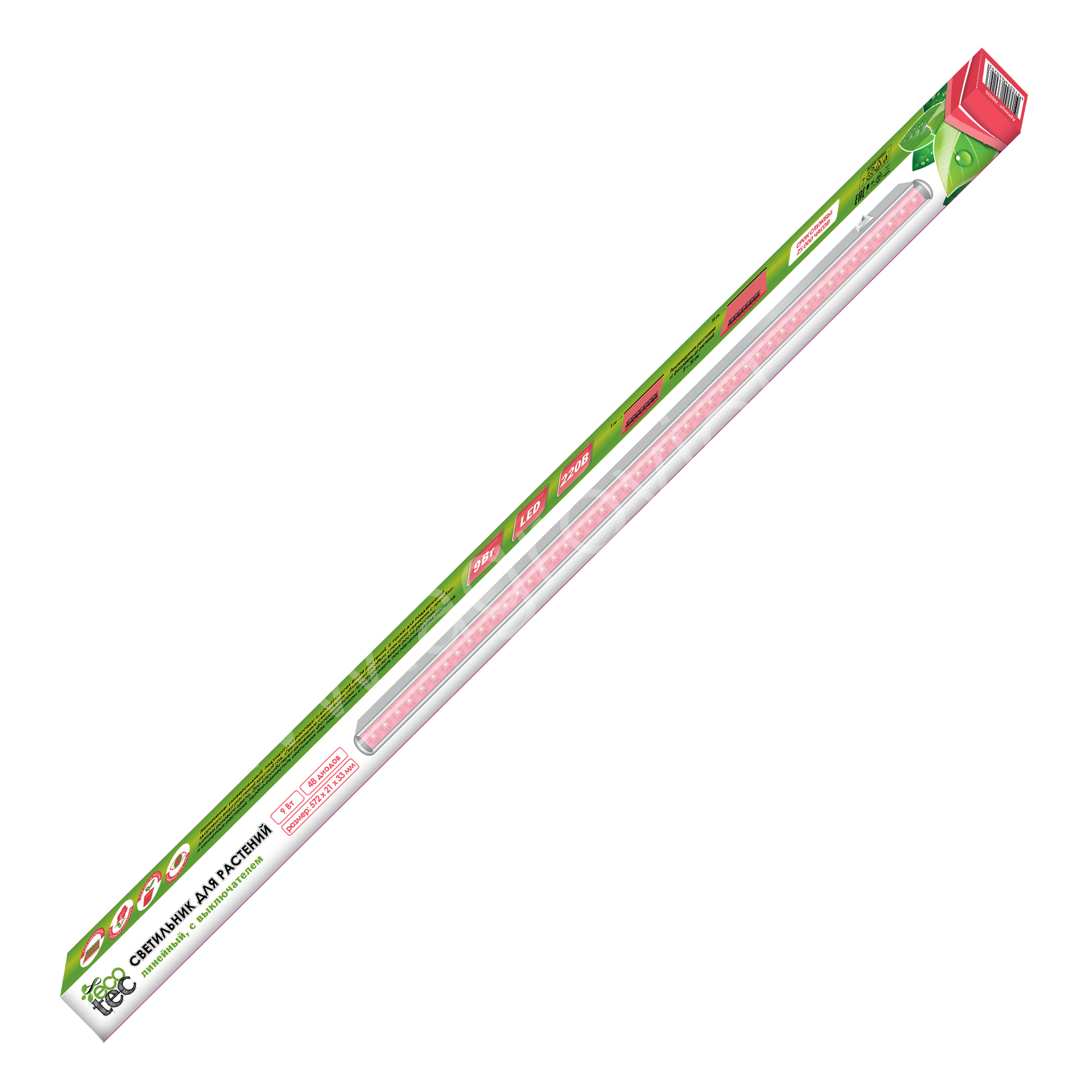 Светильник для растений линейный с выключателем ТМ «ECOTEC», 9 Вт., на базе LED-технологий обладает особым спектром свечения с преобладанием розового цвета. Это способствует активным фотохимическим процессам во время роста рассады и комнатных растений. Светильник подходит для выращивания рассады и досветки комнатных растений. Удобно разместить светильник над подоконником или на стене и подсвечивать поставленные в ряд растения. При необходимости увеличить интенсивность освещения используйте сразу несколько светильников. В комплекте идут два коннектора, которые позволяют соединить одновременно несколько приборов (до 5 штук), а также крепления. Светильник не содержит вредных веществ, не имеет побочного ультрафиолетового излучения и почти не нагревается. Его можно размещать вплотную к растениям, не боясь, что побеги и листья получат ожоги. Рекомендуется размещать светильник на расстоянии 5-30 см от растения. Размер: 572х21х33 мм. Количество ультраярких светодиодов: 48 шт. Угол свечения: 110°.